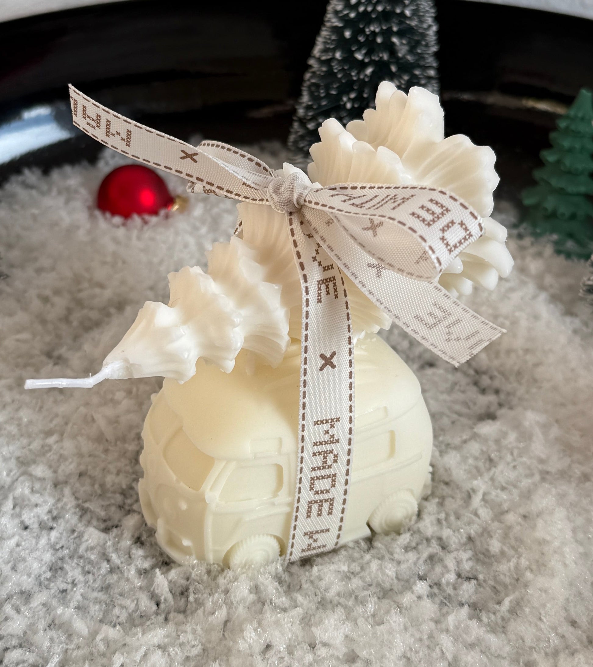 🚌🎄 Buskaars met kerstboom – Handgemaakte kerstkaars met retro-bedel