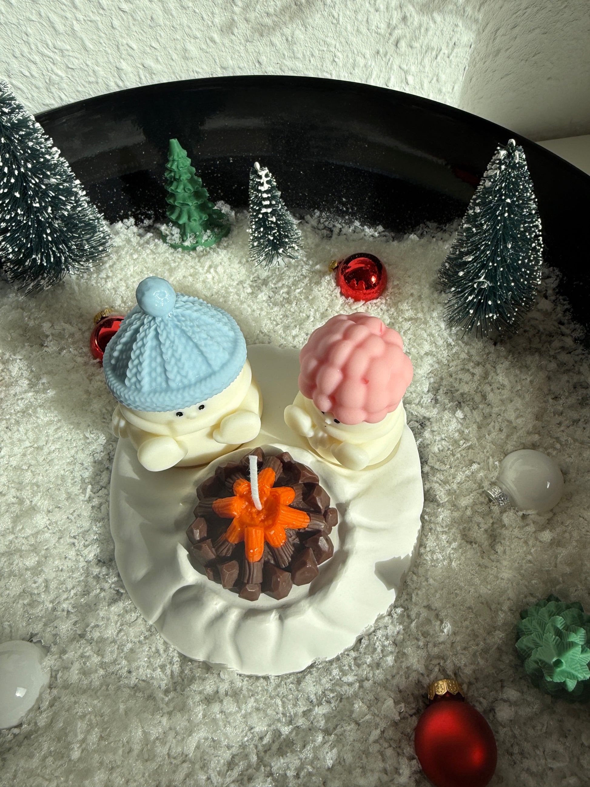 ❄️ IJslandschapskaars – Handgemaakt winterlandschap met sneeuwpop, sneeuwvrouw en kampvuur