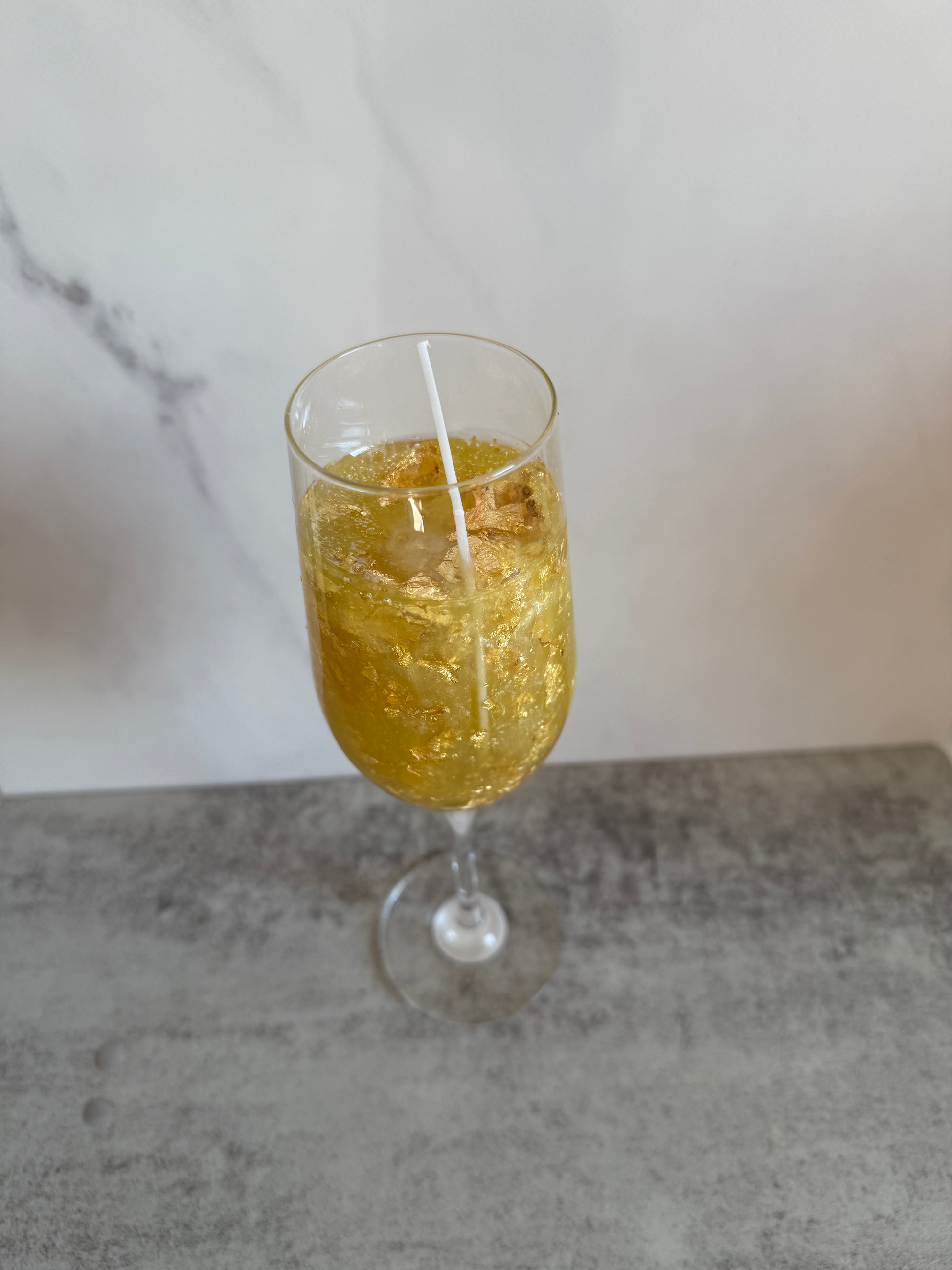 Vier het in stijl met onze handgemaakte nieuwjaarskaars! Gegoten in een elegant champagneglas en versierd met gouden accenten, brengt hij een feestelijke sfeer in huis – perfect voor oudejaarsavond of speciale gelegenheden.