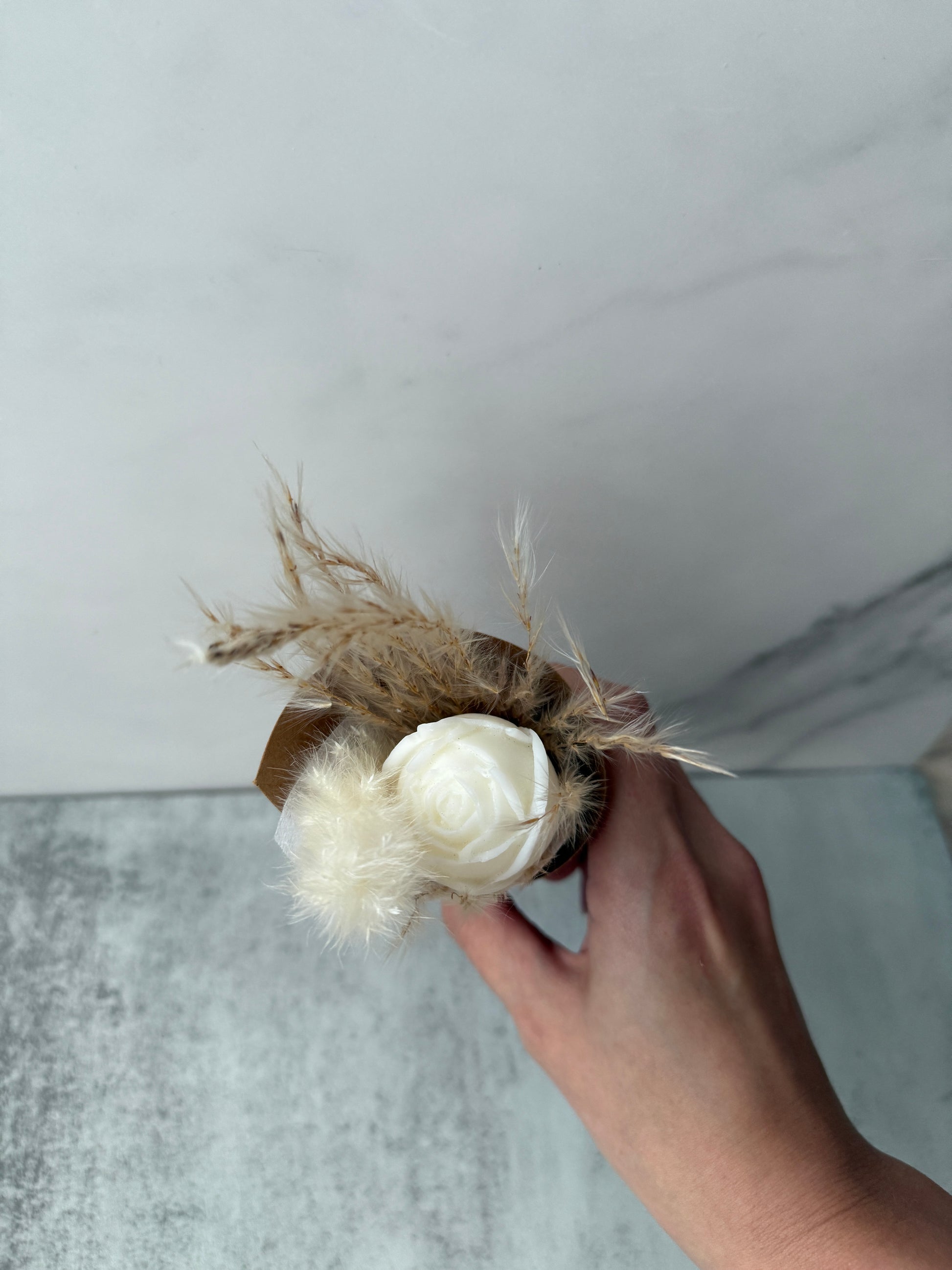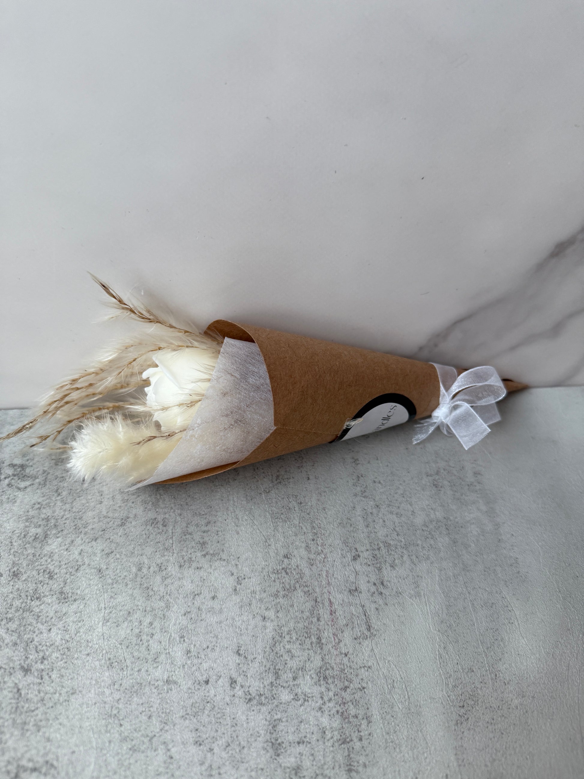 Diese liebevoll gestaltete Wachsrose im Papierkegel mit Trockenblumen ist eine ganz besondere Art, "Ich denk an dich" zu sagen. Die realistisch geformte Rose aus Wachs wird von naturbelassenen Trockenblumen ergänzt und in einem schlichten Kraftpapierstrauß arrangiert – perfekt als kleines Geschenk für Geburtstage, Muttertag, Valentinstag oder als stilvolles Mitbringsel.