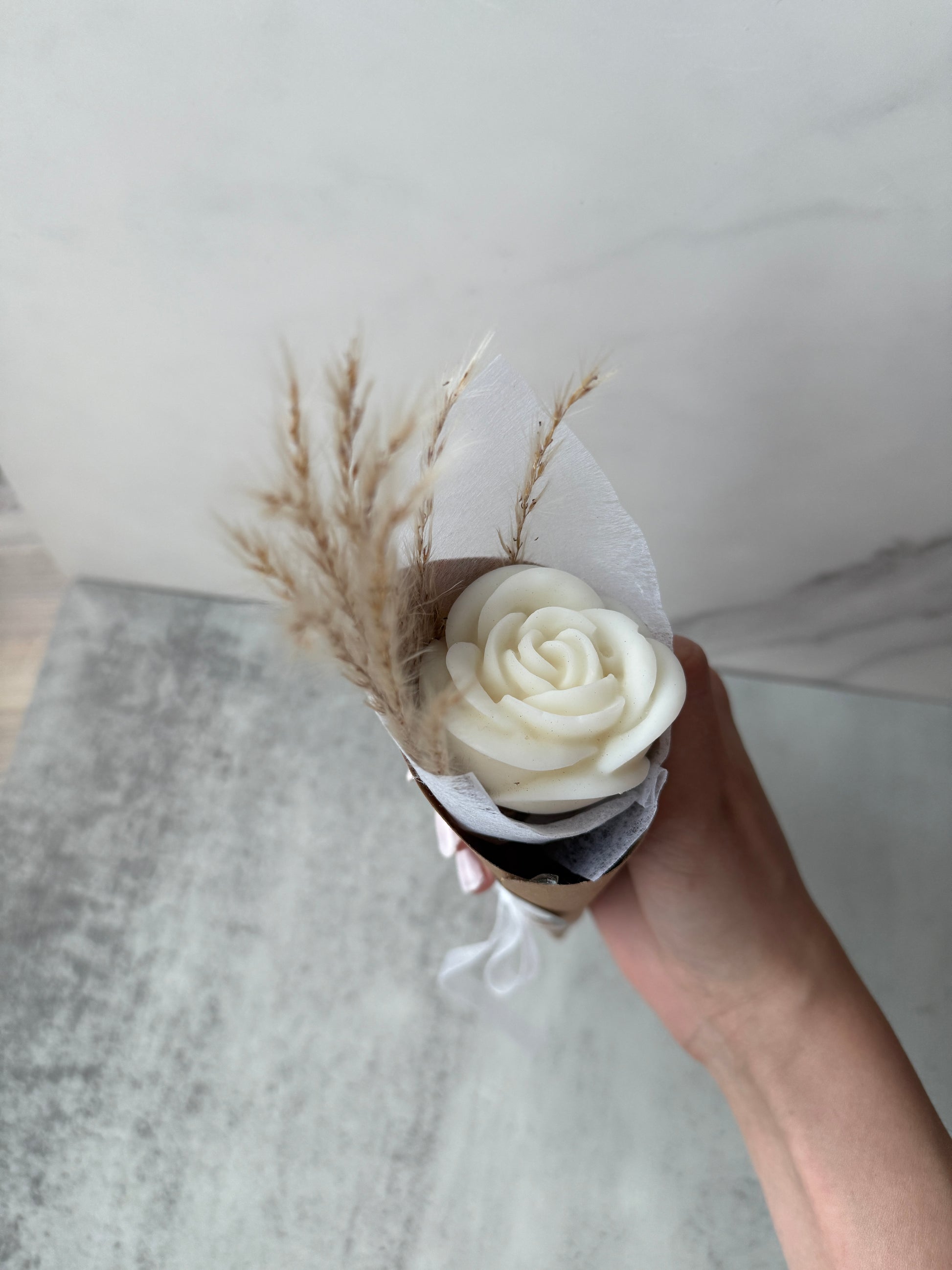 Diese liebevoll gestaltete Wachsrose im Papierkegel mit Trockenblumen ist eine ganz besondere Art, "Ich denk an dich" zu sagen. Die realistisch geformte Rose aus Wachs wird von naturbelassenen Trockenblumen ergänzt und in einem schlichten Kraftpapierstrauß arrangiert – perfekt als kleines Geschenk für Geburtstage, Muttertag, Valentinstag oder als stilvolles Mitbringsel.