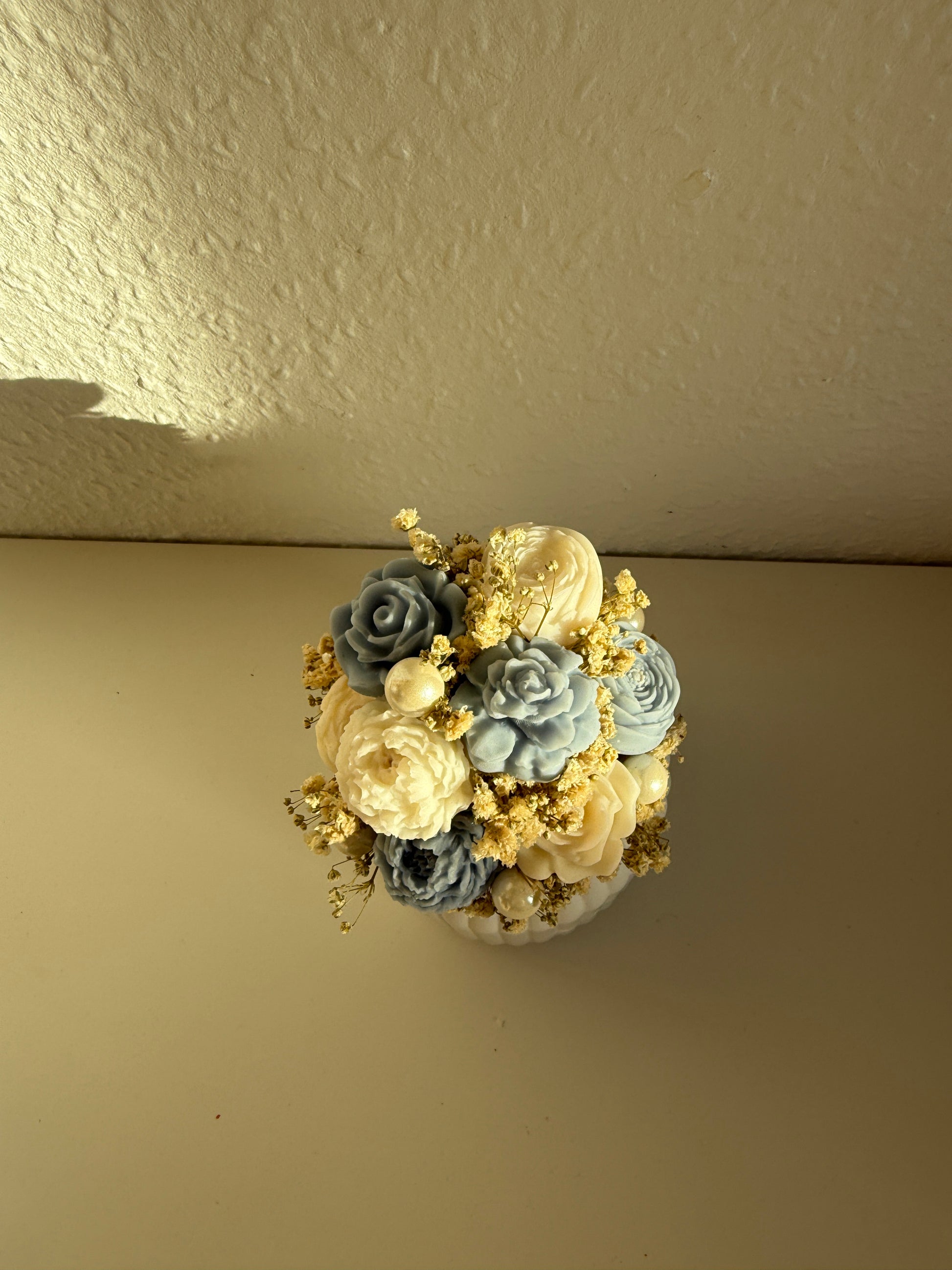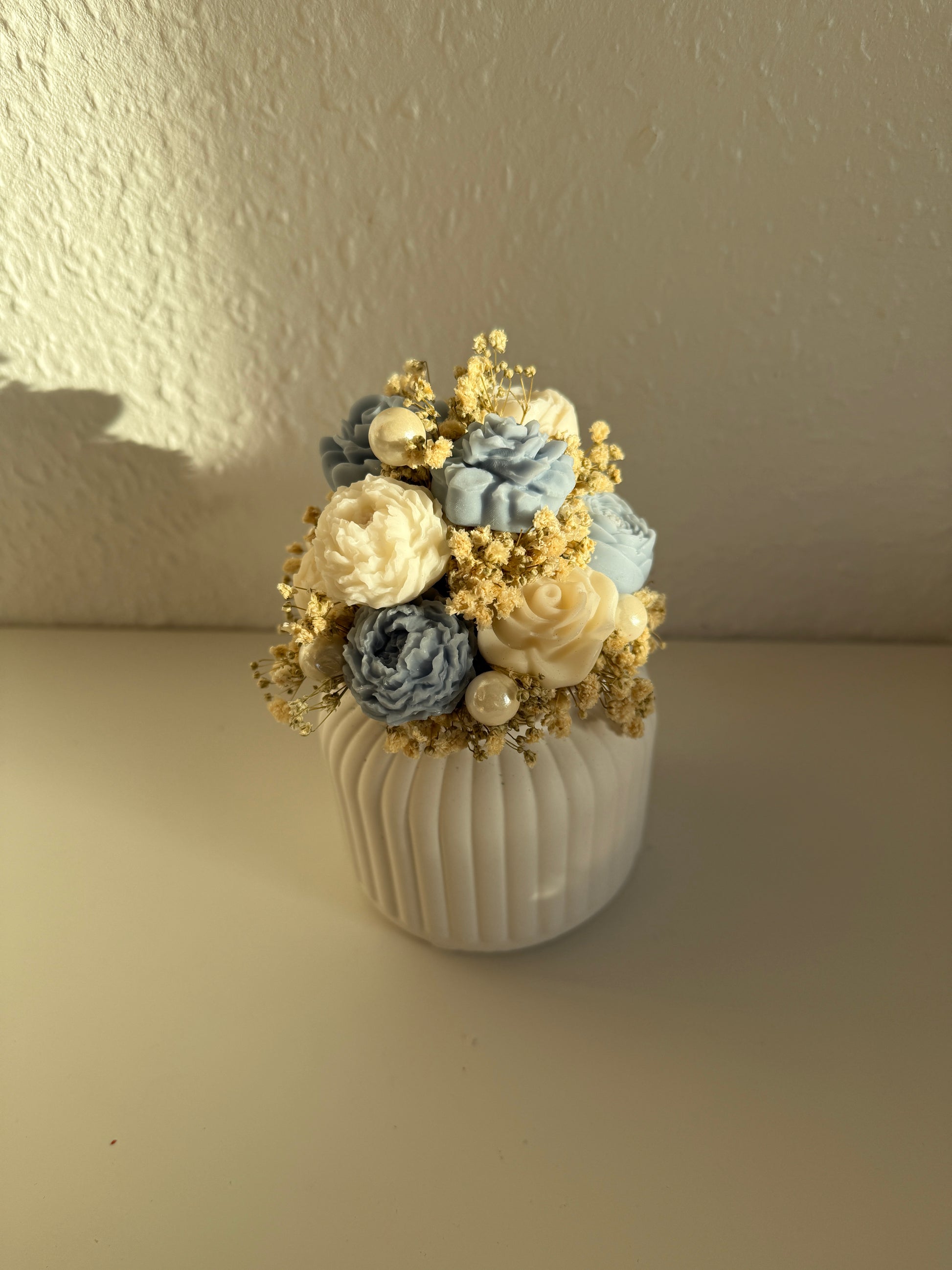 Dieses Blumen Arrangement ist eine exklusive Kombination aus detailreich gestalteten Wachsblüten und einem von Hand gegossenen Premium-Gefäß.