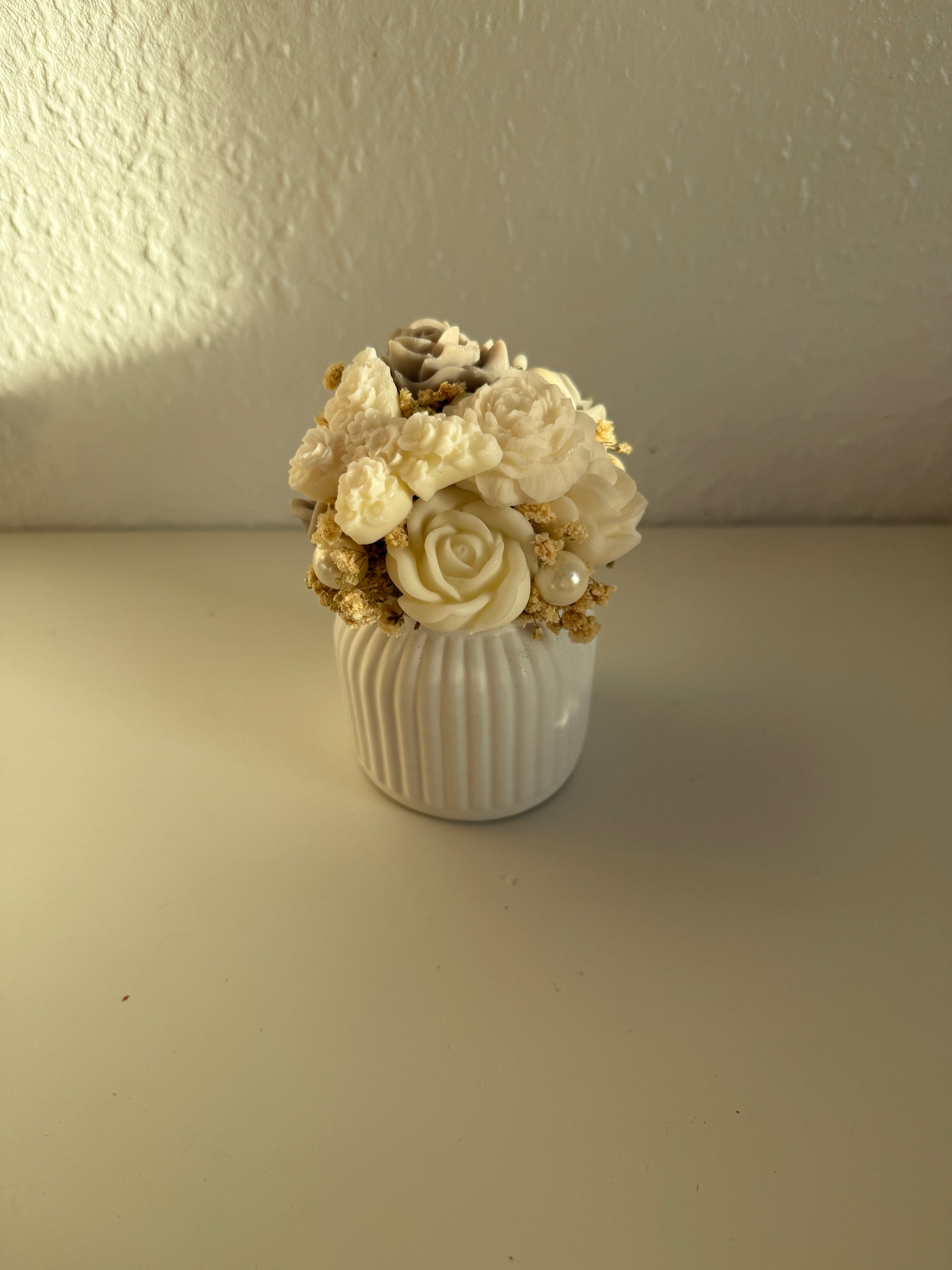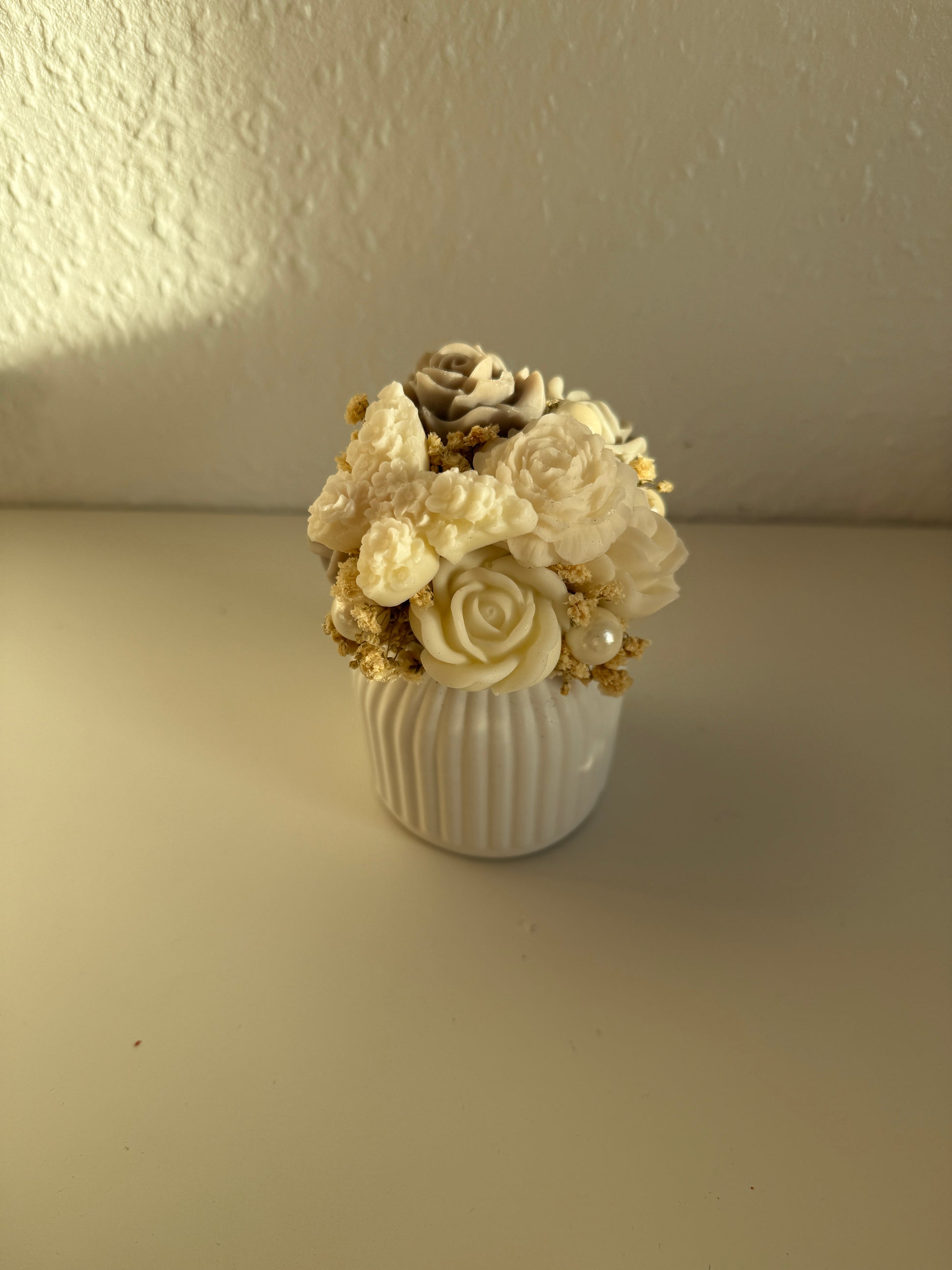 Dieses Blumen Arrangement ist eine exklusive Kombination aus detailreich gestalteten Wachsblüten und einem von Hand gegossenen Premium-Gefäß.