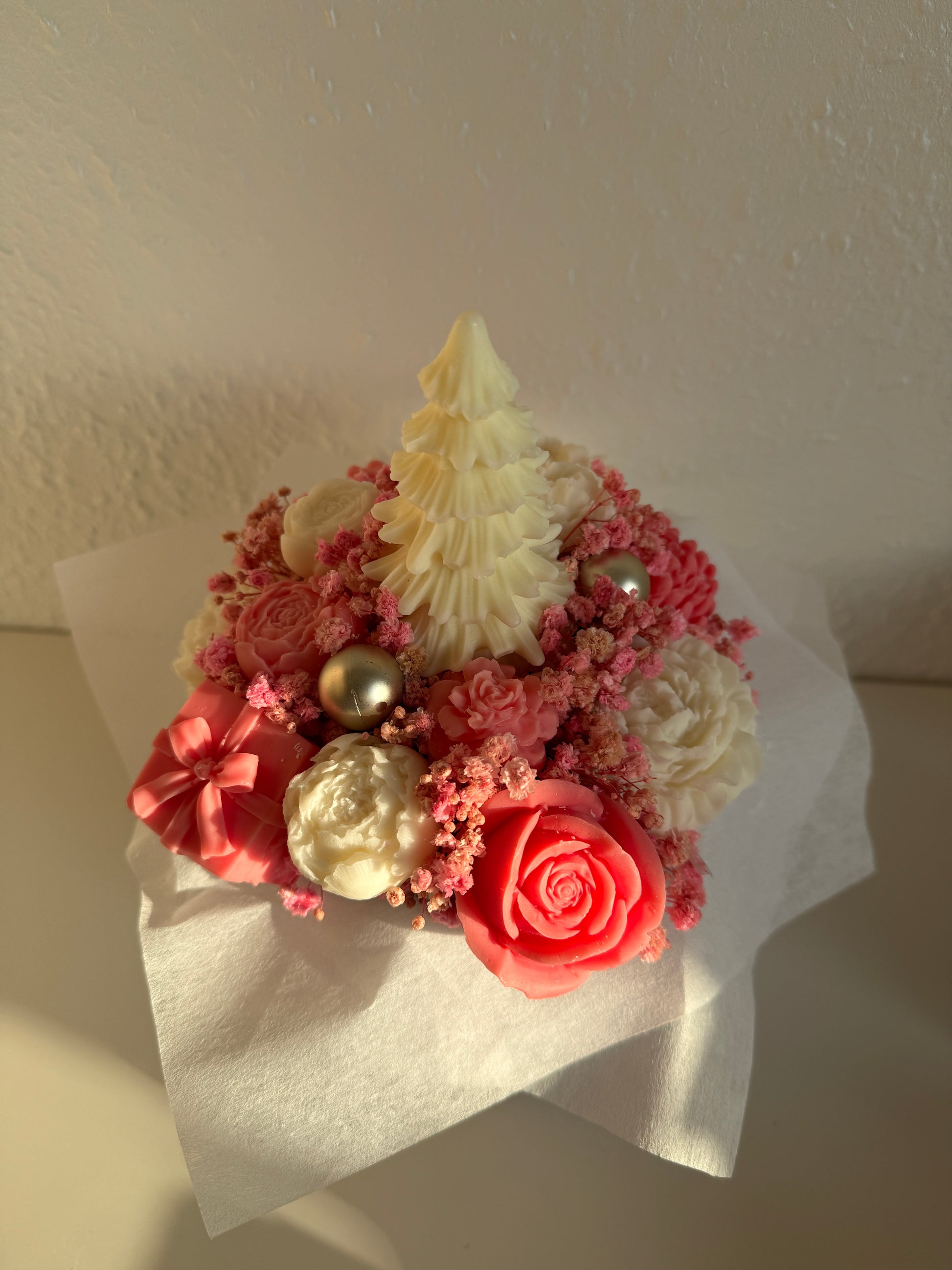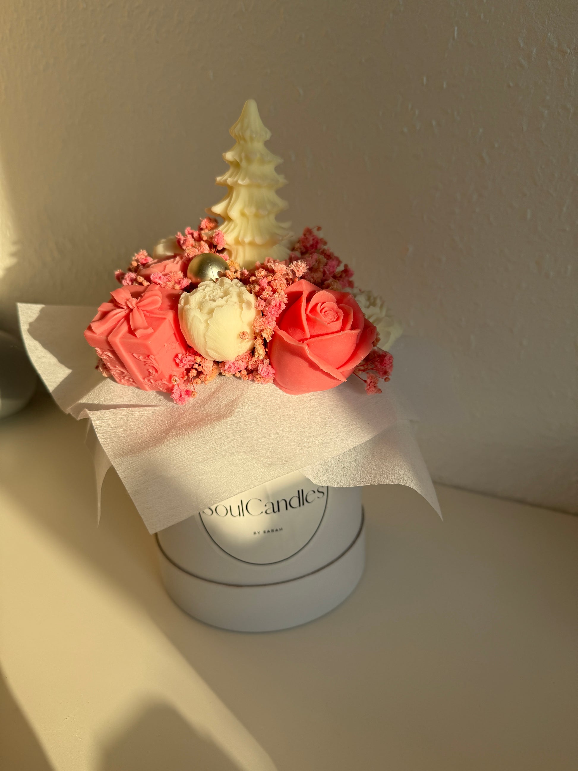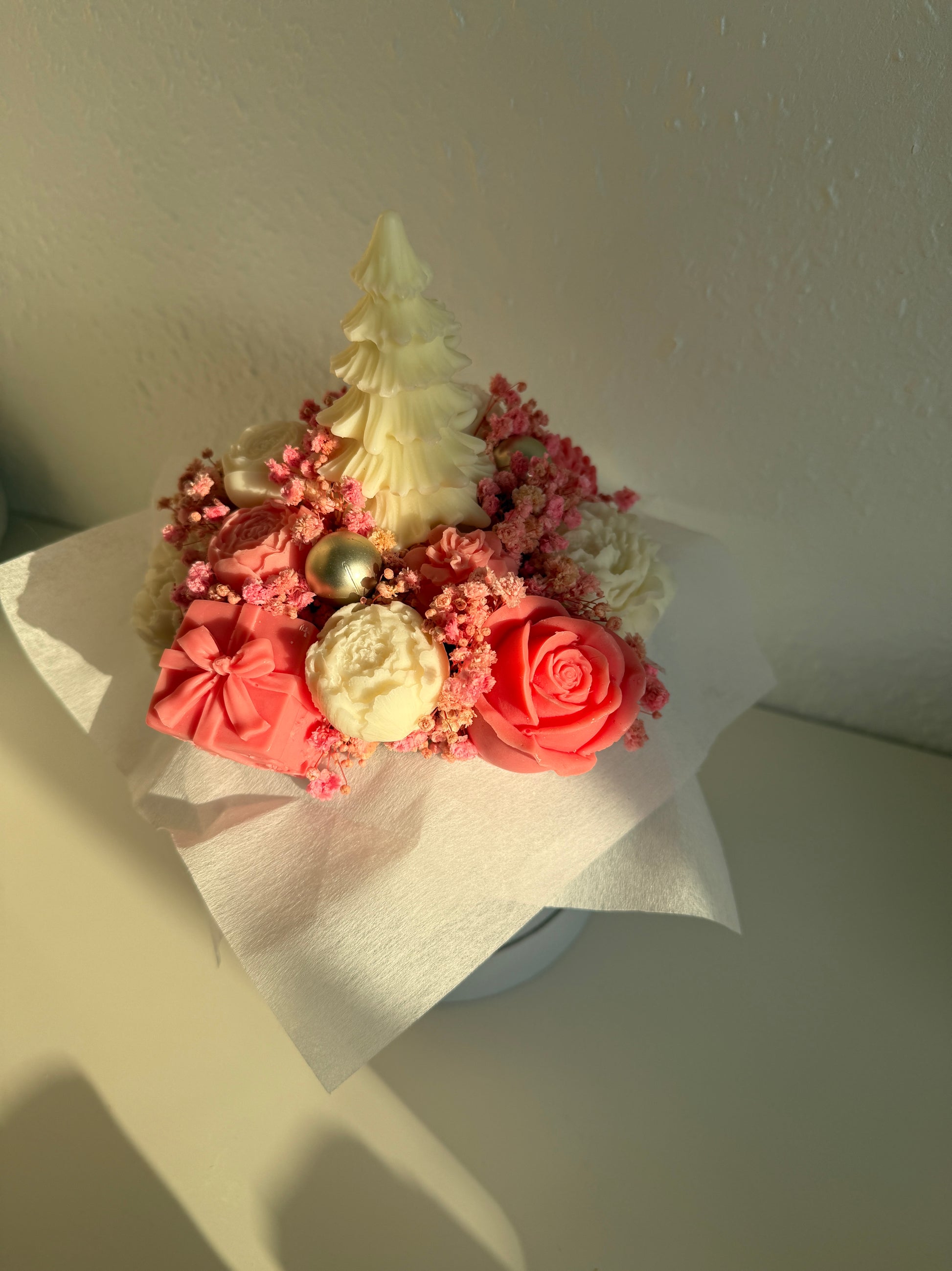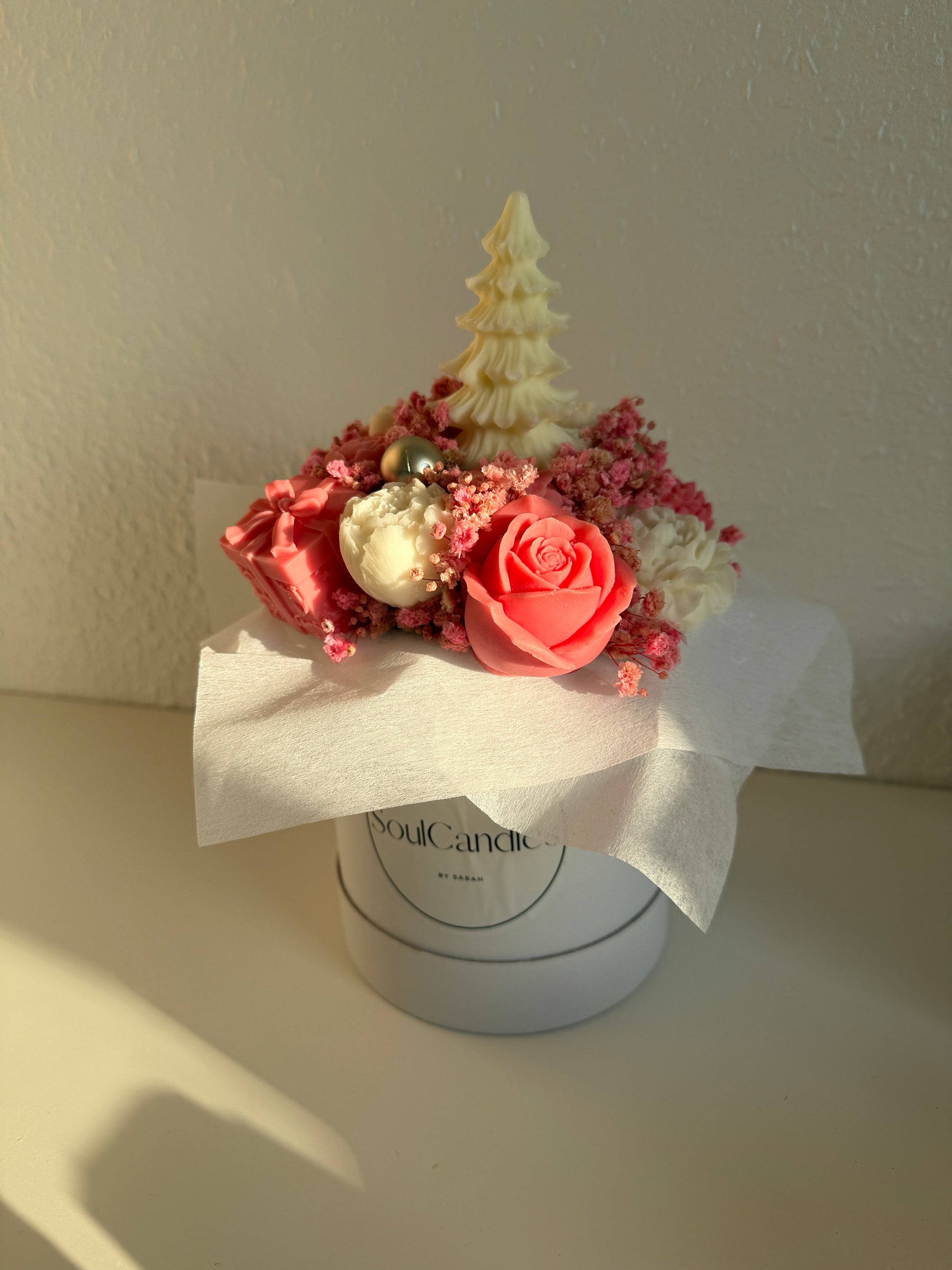 Unser festliches Blütenarrangement kombiniert kunstvoll modellierte Wachsblüten in warmen Rosé-, Creme- und Koralltönen mit einem detailverliebt gearbeiteten Wachs-Tannenbaum als Highlight.