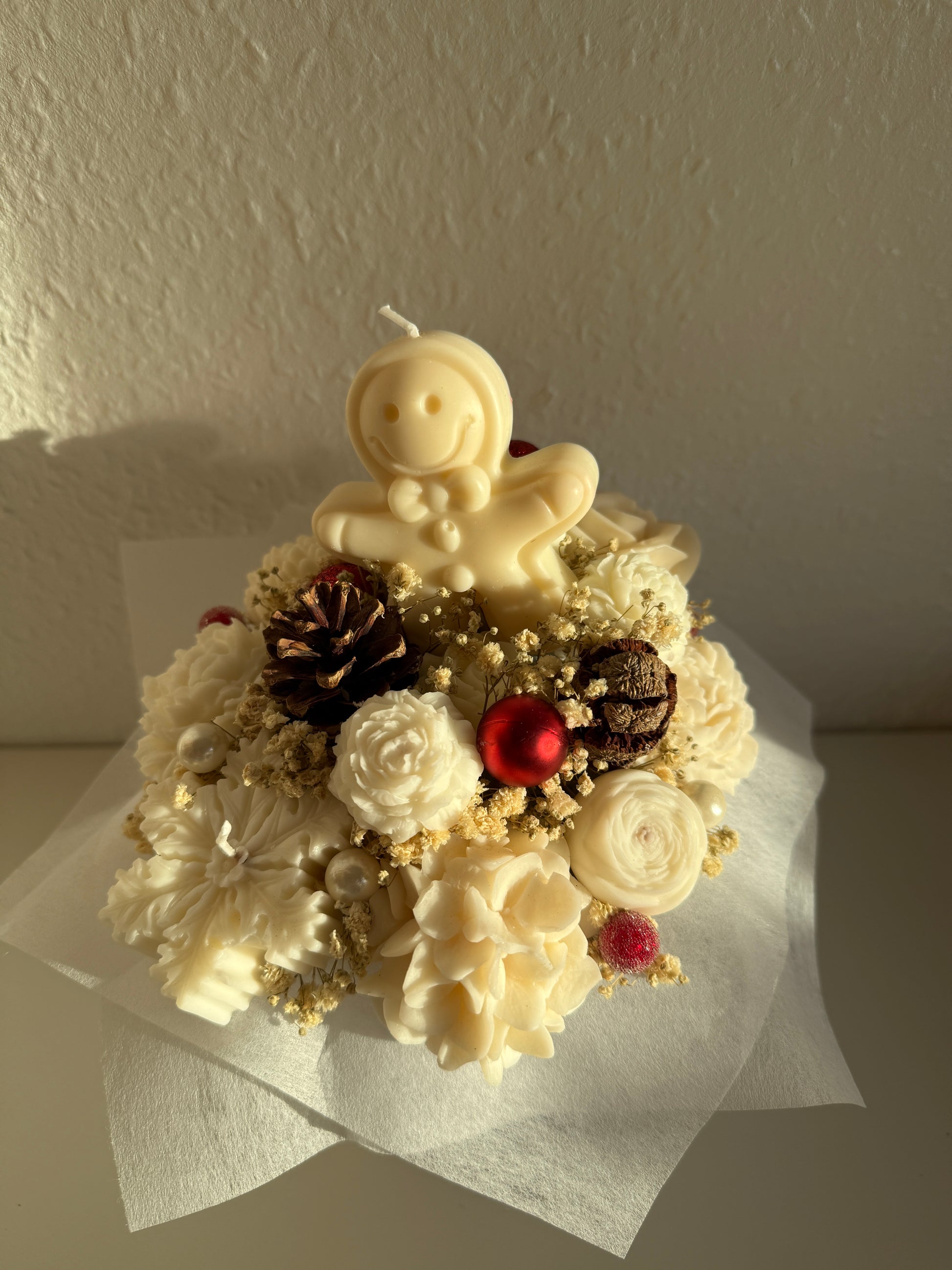 Dieses Lebkuchenmann Blütenarrangement vereint winterliche Details, kunstvoll modellierte Wachsblüten und einen liebevoll gestalteten Lebkuchenmann als festliches Highlight.